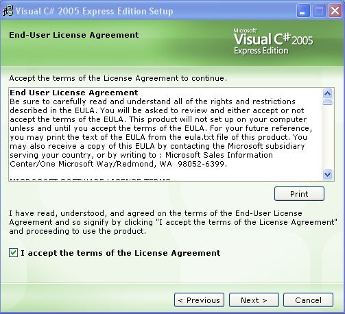 Installing Visual C# Express Edition To work with XNA Game Development Studio with all of it’s goodies, you will need to be working in C# Express Edition. If you’re not familiar with C# but program in managed code already, don’t worry, it’s fairly easy to pick up. If you’re worried about cost, don’t be. The C# Express Edition is a free download from Microsoft. So, go ahead and download C# Express Edition now and then follow the steps below to get it installed and registered. Once the download is complete. Double-click on the “vcssetup.exe” icon to launch the C# Express setup application. This will bring up the following screen.